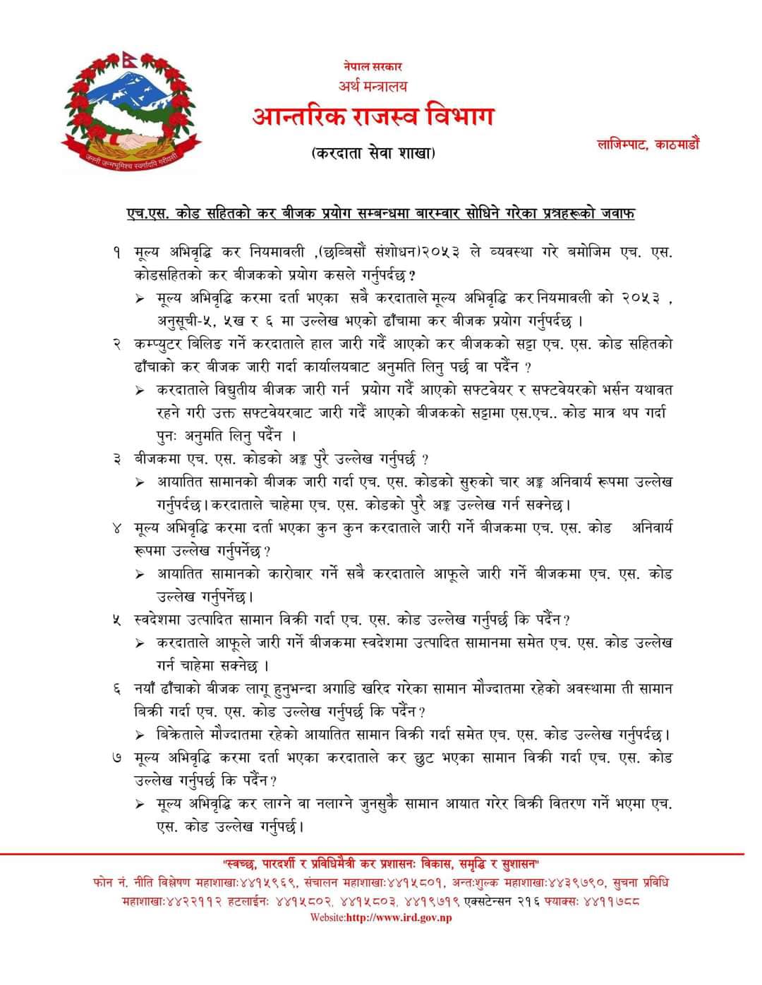 Since the Finance Bill 2081 had mandated the issue of Tax Invoice along with HS Code printed in it, the IRD has released a FAQs regarding the...